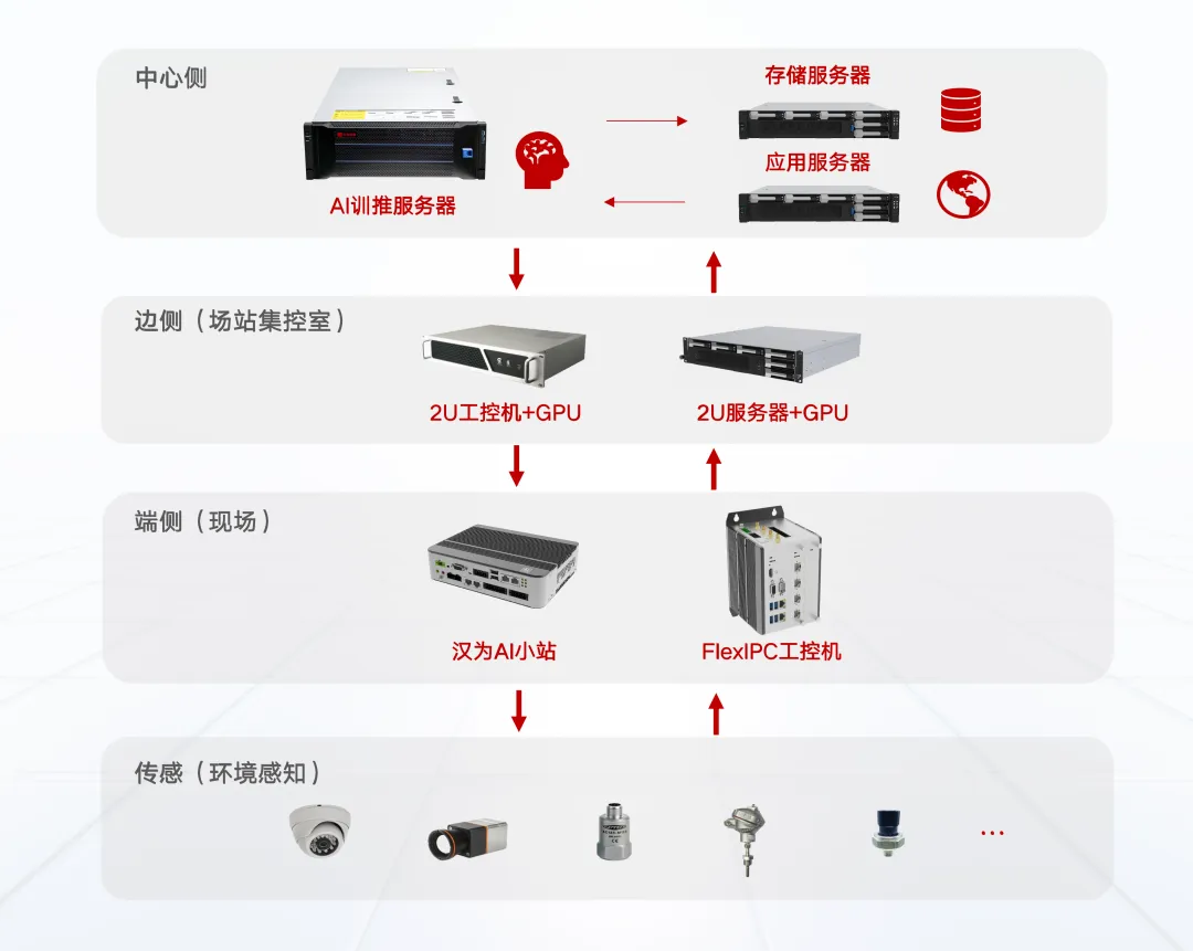端侧 AI 计算机部署在数据产生的第一线,核心在于 “单机闭环”,即依托设备自身的 CPU 与 AI 算力,独立完成感知、推理与实时控制。其算力基础设施为基于 飞腾腾锐D3000M/D2000、飞腾腾珑 E2000Q 的汉为新一代 FlexIPC 系列模块化工控机。