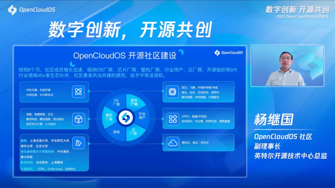 OpenCloudOS 社区副理事长、英特尔开源技术中心总监杨继国表示: