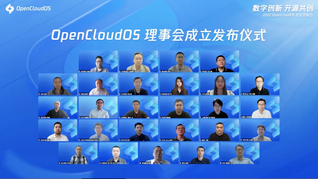 理事会有来自海云捷迅、京东云、OPPO、同方有云、北京初心、先进开源、Circle Linux、中科曙光、同元软控、中兴新支点、北京红旗软件、Intel、中科方德、浪潮信息、飞腾、上海交大、中兴通讯、兆芯、中讯邮电咨询设计院、龙芯、腾讯、云启资本、上海博成、北京大学粤港澳大湾区知识产权发展研究院、积梦智能、作业帮等 26 家单位的理事代表出席。