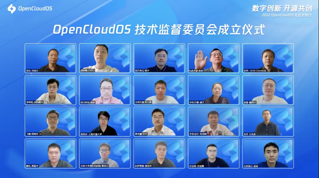 技术监督委员会有来自海云捷迅、京东云、OPPO、同方有云、先进开源、Circle Linux、中科曙光、同元软控、北京红旗软件、中科方德、浪潮信息、飞腾、上海交大、中兴通讯、中讯邮电咨询设计院、龙芯、腾讯、北京大学粤港澳大湾区知识产权发展研究院、积梦智能、作业帮等 20 家单位的委员代表出席。