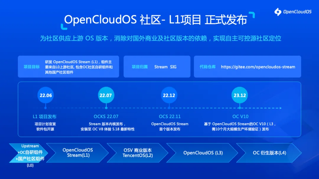 6 月 22 日,在 2022 OpenCloudOS 社区开放日上,国产开源操作系统 OpenCloudOS 正式发布首个源社区(L1)项目及首个全量软件包(L3)版本,并披露其技术研发路线图。