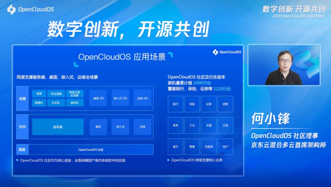 截至目前,OpenCloudOS 社区及衍生版本装机量累计超过 1000 万台,覆盖了银行、保险、证券等 12 大行业,并经历了海量场景长时间的考验。